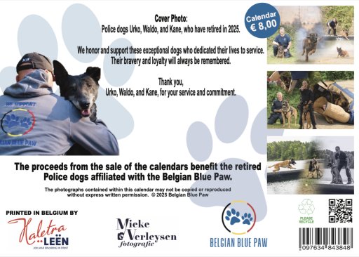 Steun de politiehonden op rust. Vanwege hun veeleisende baan hebben veel van deze gepensioneerde honden extra zorg nodig. Door de aankoop van deze kalender help je mee de medische zorgen en zorgkosten te ondersteunen van deze helden op 4 pootjes!
